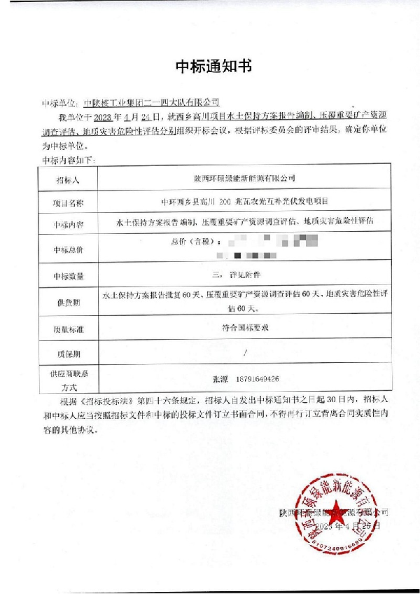 4月28日,接中標通知,中陜核工業(yè)集團二一四大隊有限公司水工環(huán)調查院在公開招標的“中環(huán)西鄉(xiāng)縣高川200MW農光互補光伏發(fā)電項目”中成功競標勝出,一舉中標該項目的水土保持方案、壓覆重要礦產資源調查和地質災害危險性評估三項技術服務工作。