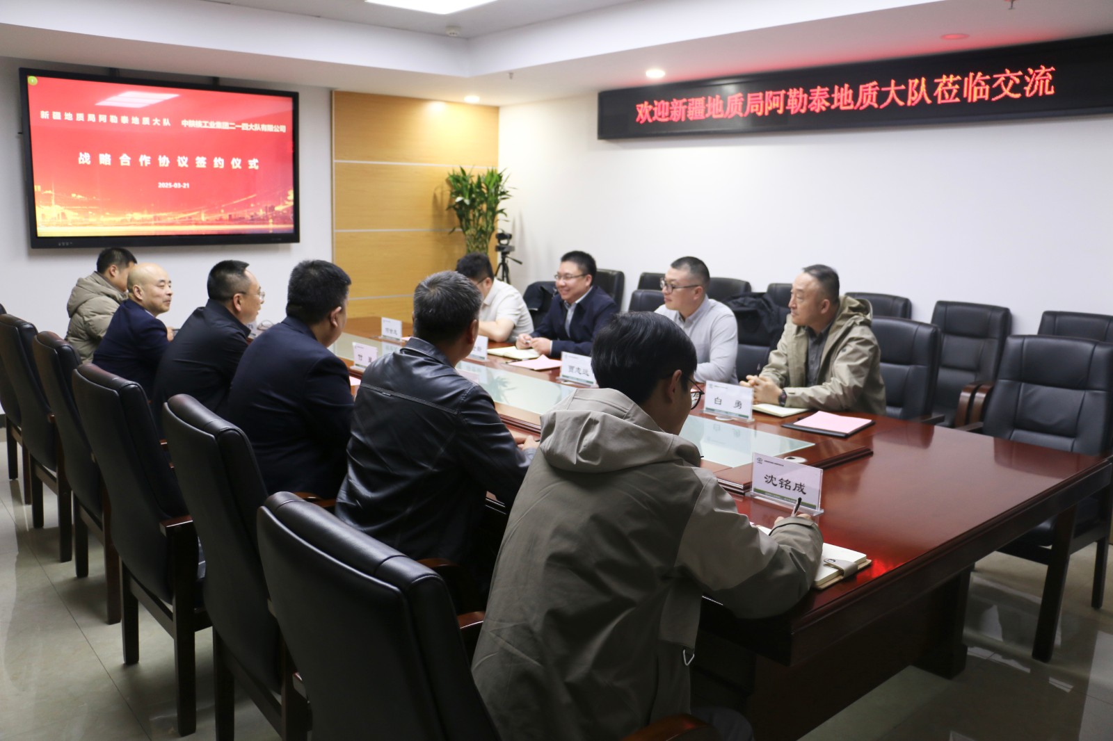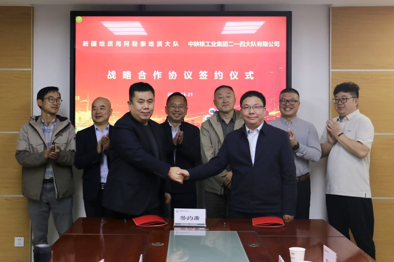 2025年3月21日,新疆地質(zhì)局阿勒泰地質(zhì)大隊(duì)黨委副書記、大隊(duì)長蔣世新帶隊(duì)到中陜核工業(yè)集團(tuán)二一四大隊(duì)有限公司進(jìn)行座談交流,并簽訂戰(zhàn)略合作協(xié)議。公司黨委書記、董事長付星主持會(huì)議,公司黨委委員、總經(jīng)理王朋、副總經(jīng)理冉軍林以及地勘相關(guān)部門負(fù)責(zé)人參加會(huì)議。
