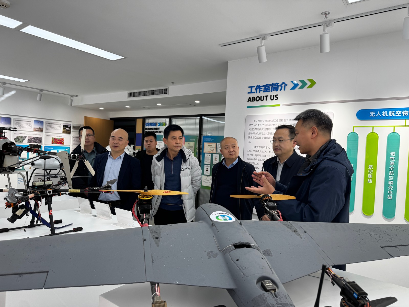 會前,王文飛一行實地參觀了二一四隊航空物探創新工作室展廳,詳細了解二一四隊在航空物探領域的技術積累、設備研發及成果轉化應用成效,對其在物探技術創新方面的前瞻性探索與實踐成果給予高度認可。