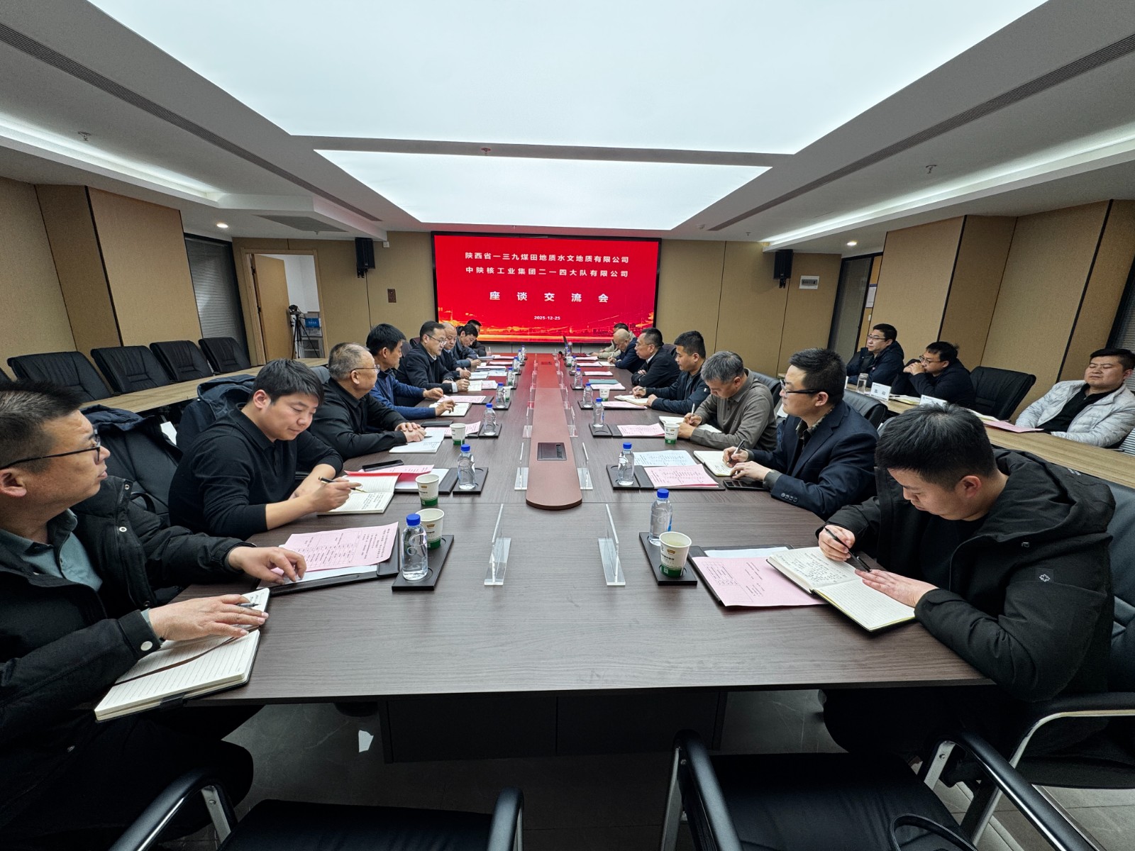 2025年12月25日下午,陜西省一三九煤田地質水文地質有限公司黨委副書記、總經理王文飛一行,赴中陜核二一四隊開展座談交流,雙方圍繞技術創新應用與項目協作事宜深入探討,凝聚合作共識。