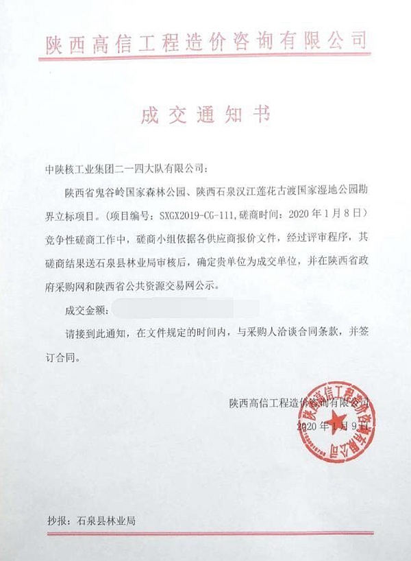 2020年1月9日,從陜西省政府采購(gòu)網(wǎng)獲悉,公司成功中標(biāo)“陜西省鬼谷嶺國(guó)家森林公園、陜西石泉漢江蓮花古渡國(guó)家濕地公園勘界立標(biāo)項(xiàng)目”。