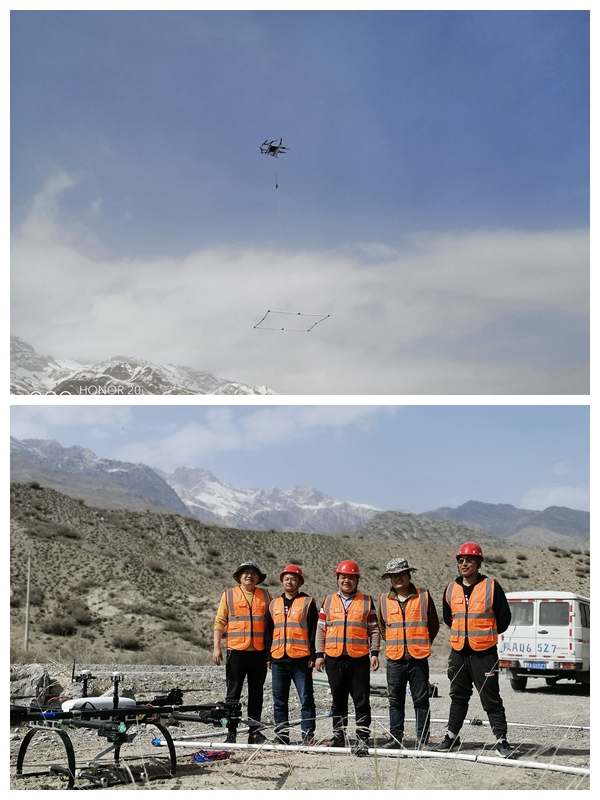 針對該項(xiàng)目工區(qū)地形切割劇烈、山勢陡峭,常規(guī)地面瞬變電磁勘查工作難以開展,受高海拔山地小氣候影響伴隨刮風(fēng)、降雪、低溫環(huán)境給飛行安全造成很大風(fēng)險。為確保核心技術(shù)攻關(guān)成果的落地和經(jīng)濟(jì)效益轉(zhuǎn)化顯著,項(xiàng)目組采用非常規(guī)氣動布局大載重旋翼無人機(jī)柔性緩沖承重結(jié)構(gòu)作為飛行平臺,搭載航空電磁儀和自主研發(fā)的重載荷大接收面積接收線圈實(shí)現(xiàn)外業(yè)數(shù)據(jù)采集,技術(shù)團(tuán)隊(duì)齊心協(xié)力完成了空域飛行備案,按設(shè)計(jì)時間節(jié)點(diǎn)保質(zhì)保量完成了外業(yè)數(shù)據(jù)采集。在項(xiàng)目的實(shí)施過程中,一線黨員主動發(fā)揮先鋒模范作用,極大激勵一線技術(shù)人員追趕新技術(shù)、學(xué)習(xí)新知識、靈活新思路、向業(yè)界難題發(fā)起攻關(guān)。