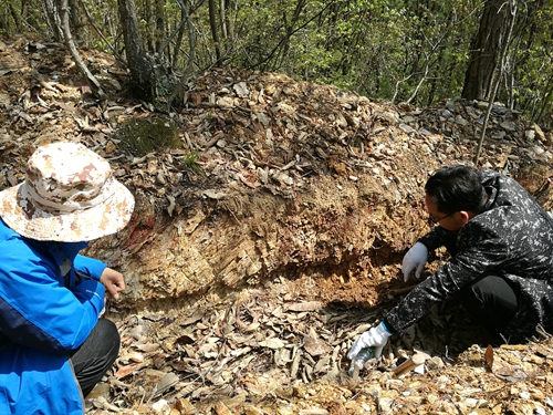 12日上午,王義忠到項目部后先聽取了項目人員對該區工作進展情況的匯報,然后深入野外一線實地指導,檢查探槽工程施工編錄質量、追索異常源、尋找礦化信息。