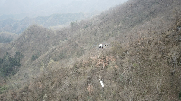 該項目地處陜南湖北交界地區(qū),工區(qū)地形切割強烈,山勢極為陡峭,垂直高差近650米,普通地表物探手段根本無法施工。項目組采用了長航時油電混合動力多旋翼無人機,搭載高精度鉀光泵磁力儀等先進設(shè)備,通過自主研發(fā)的起伏地形航線規(guī)劃軟件技術(shù)進行超低空仿地形飛行,有效保障了數(shù)據(jù)的采集質(zhì)量。
